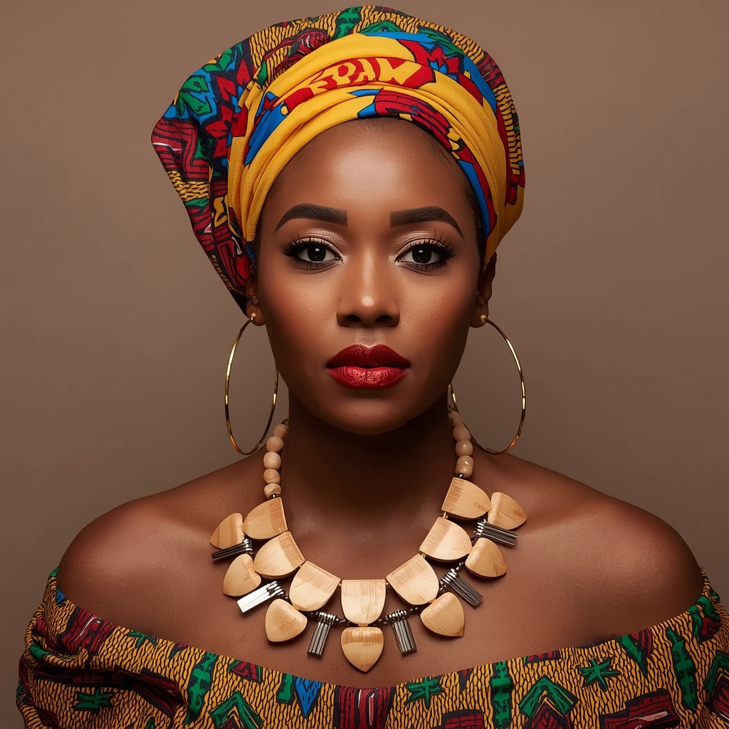 Across these four UZURI Studio portraits, a single visual argument emerges with increasing clarity: color, when handled with discipline, is not decoration. It is structured. The wrapped headpiece in each frame — vivid with yellow, red, blue, and geometric print — does not merely cover the head. It builds the silhouette. It gives the face context, a frame, a reason to hold the eye exactly where the image needs it. Remove the wrap, and you have a portrait. Keep it, and you have a statement.